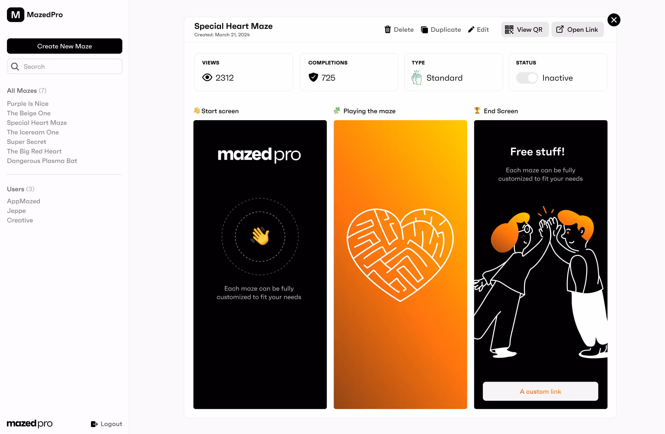 Create, manage and track your mazes & campaigns.
